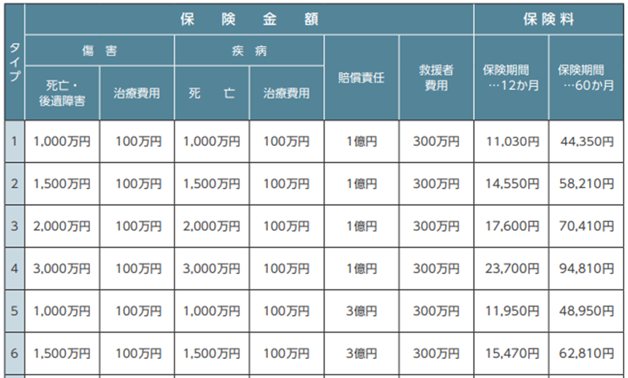 下表に掲載のないタイプや保険期間については保険料ページをご覧いただくか、国際研修サービスまでお問合せください。