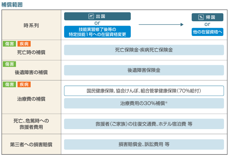 ※ 治療費用の支払責任の一部変更に関する特約がセットされているため、公的保険制度にご加入されている場合の傷害および疾病の治療費用については、保険金額を上限に、病院などに直接支払った自己負担が保険金お支払の対象となりますが、公的保険制度にご加入されていない場合(雇用契約が発効されず健康保険等の被保険者になっていない場合、健康保険等の被保険者であっても健康保険対象外の治療によって健康保険等からの給付がなされない場合、特定技能1号終了後の日本国を出国してから母国等で帰国手続きを終了するまでの間で健康保険等の被保険者になっていない場合等)は、実際に負担される治療費用に30%を乗じた額でのお支払いになります。