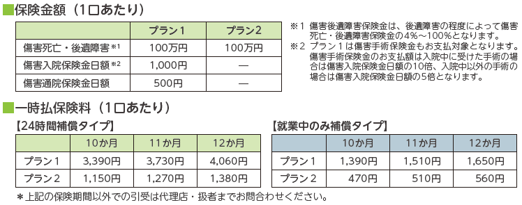 保険期間中に発生した急激かつ偶然な外来の事故により、被保険者(保険の対象となる方)がケガをされたときに保険金をお支払いする商品です。